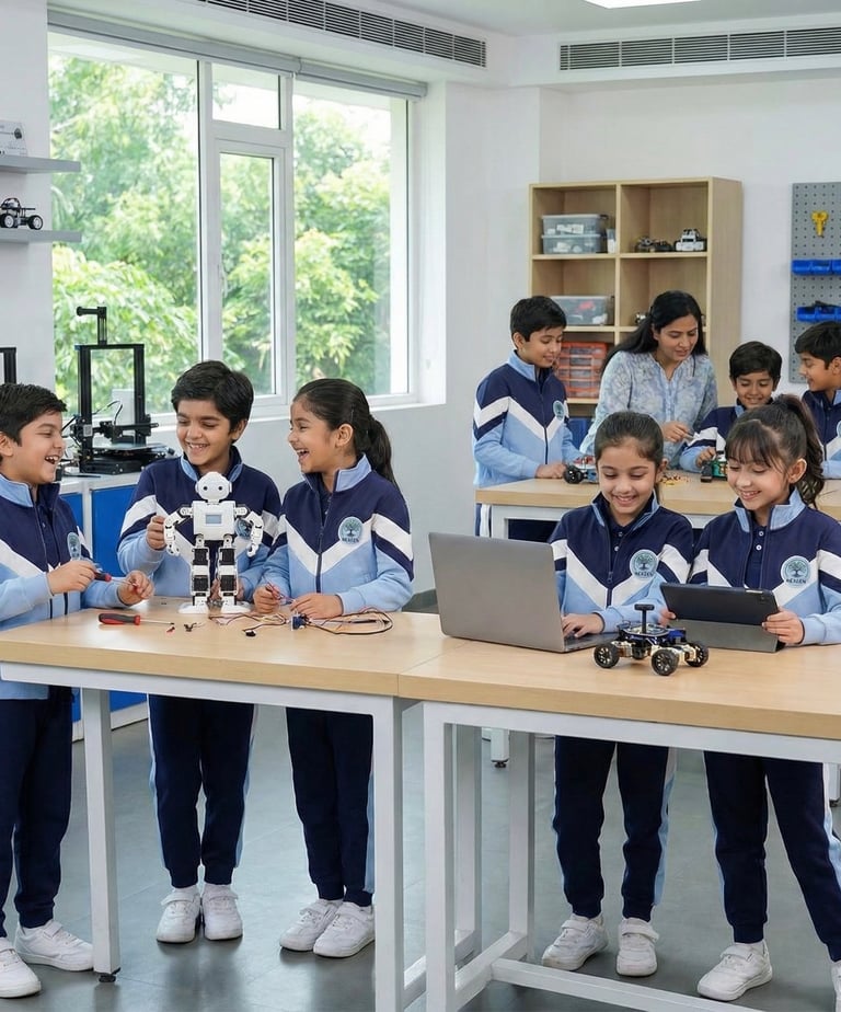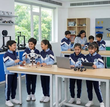 Every facility is thoughtfully designed not just to educate, but to inspire, refine, and support holistic growth beyond traditional learning. Our Smart Safety Network, fully AC campus, Digital Library, Language Studio, Robotics & Maker Lab, 3D Dolby Atmos Learning Theatre, and Box Sports Arena all serve one purpose to provide a safe, modern, and vibrant space where children don't just learn they truly evolve and realise their highest potential.